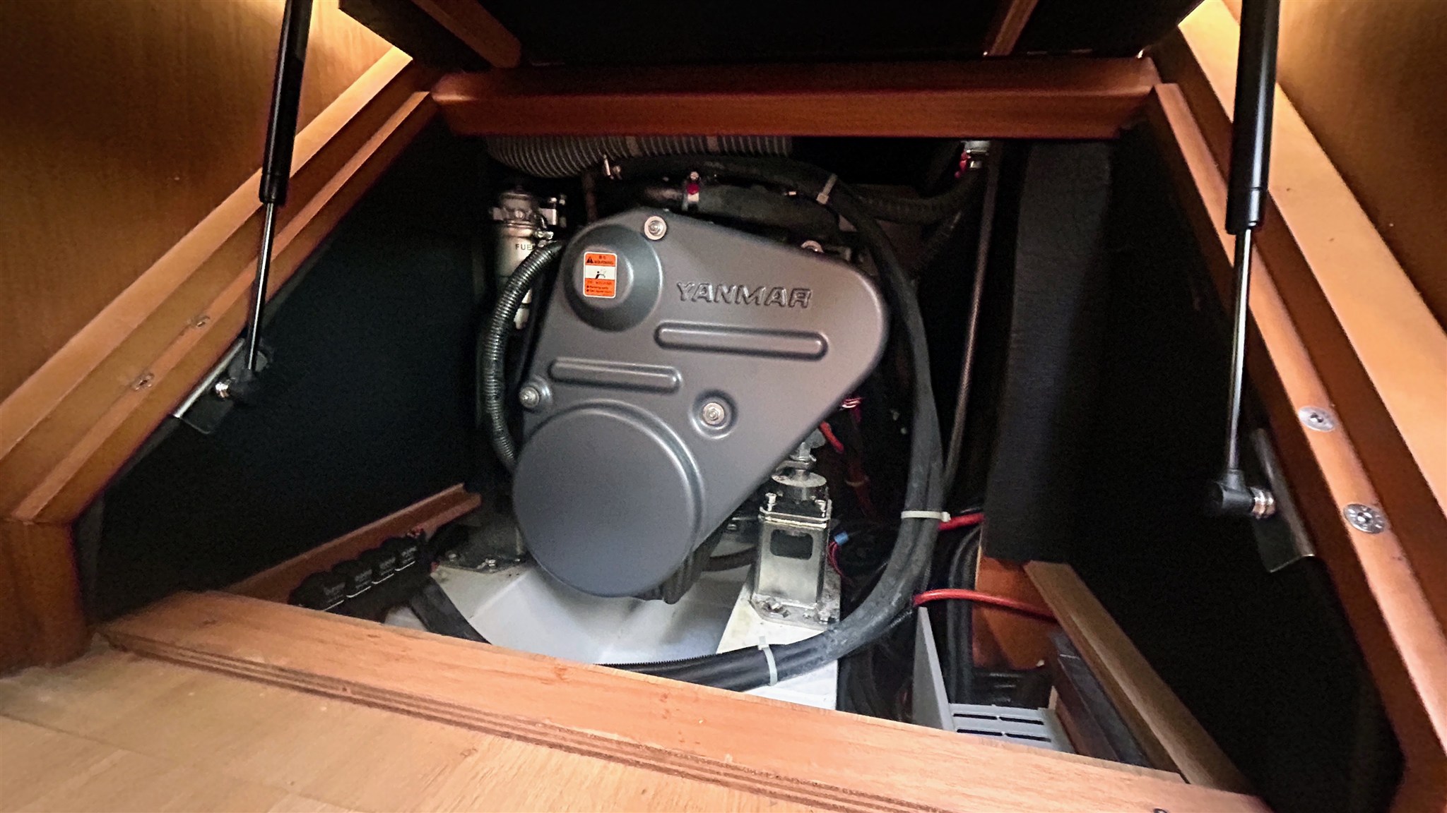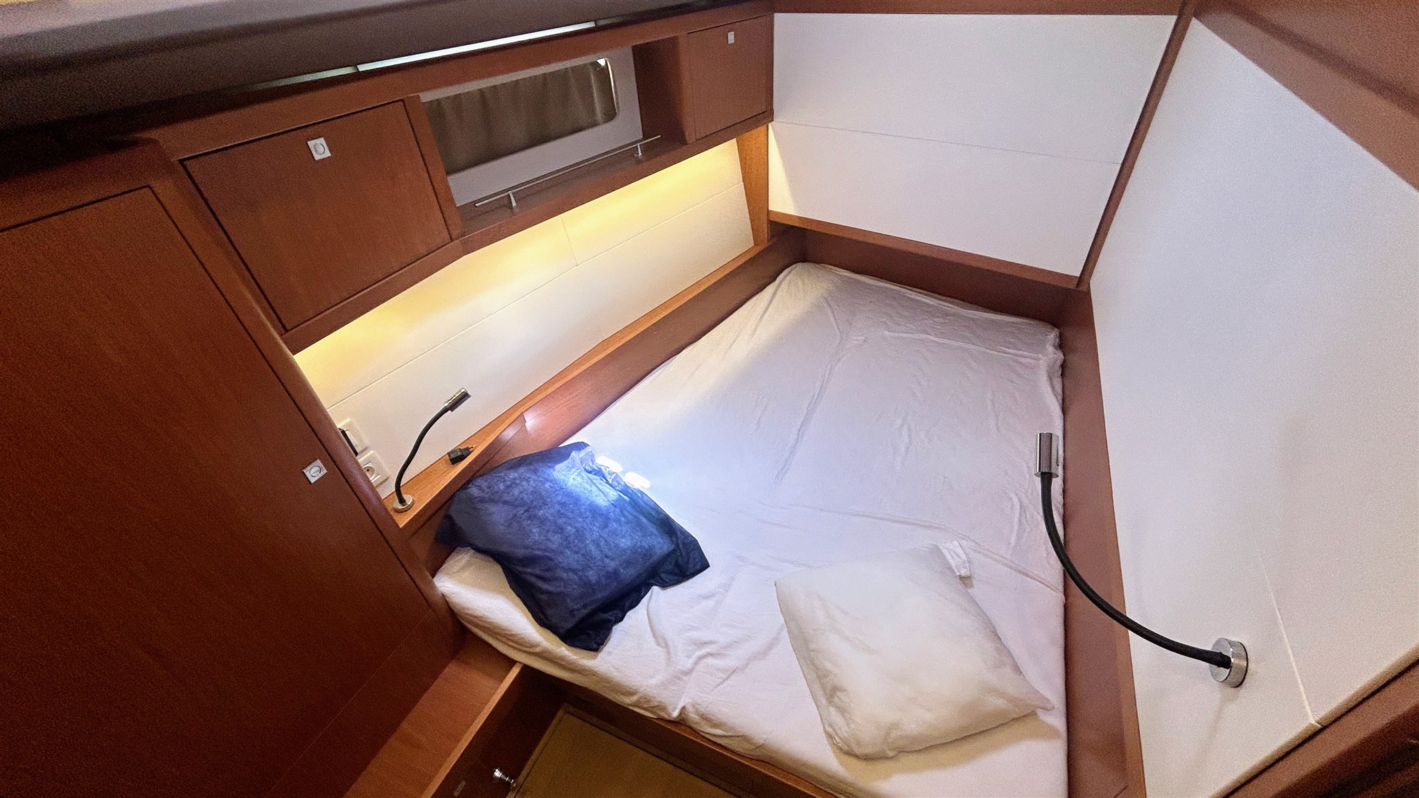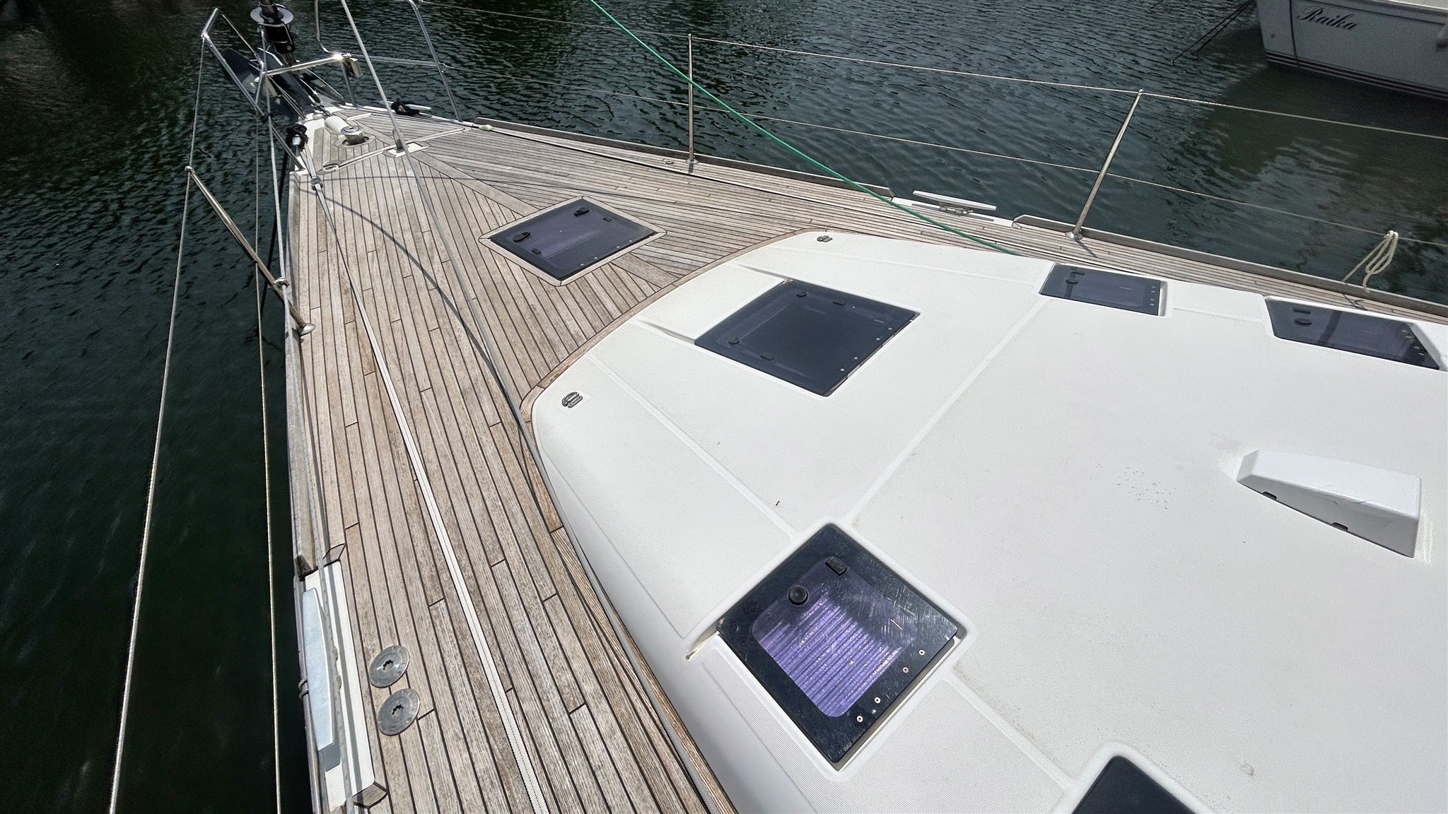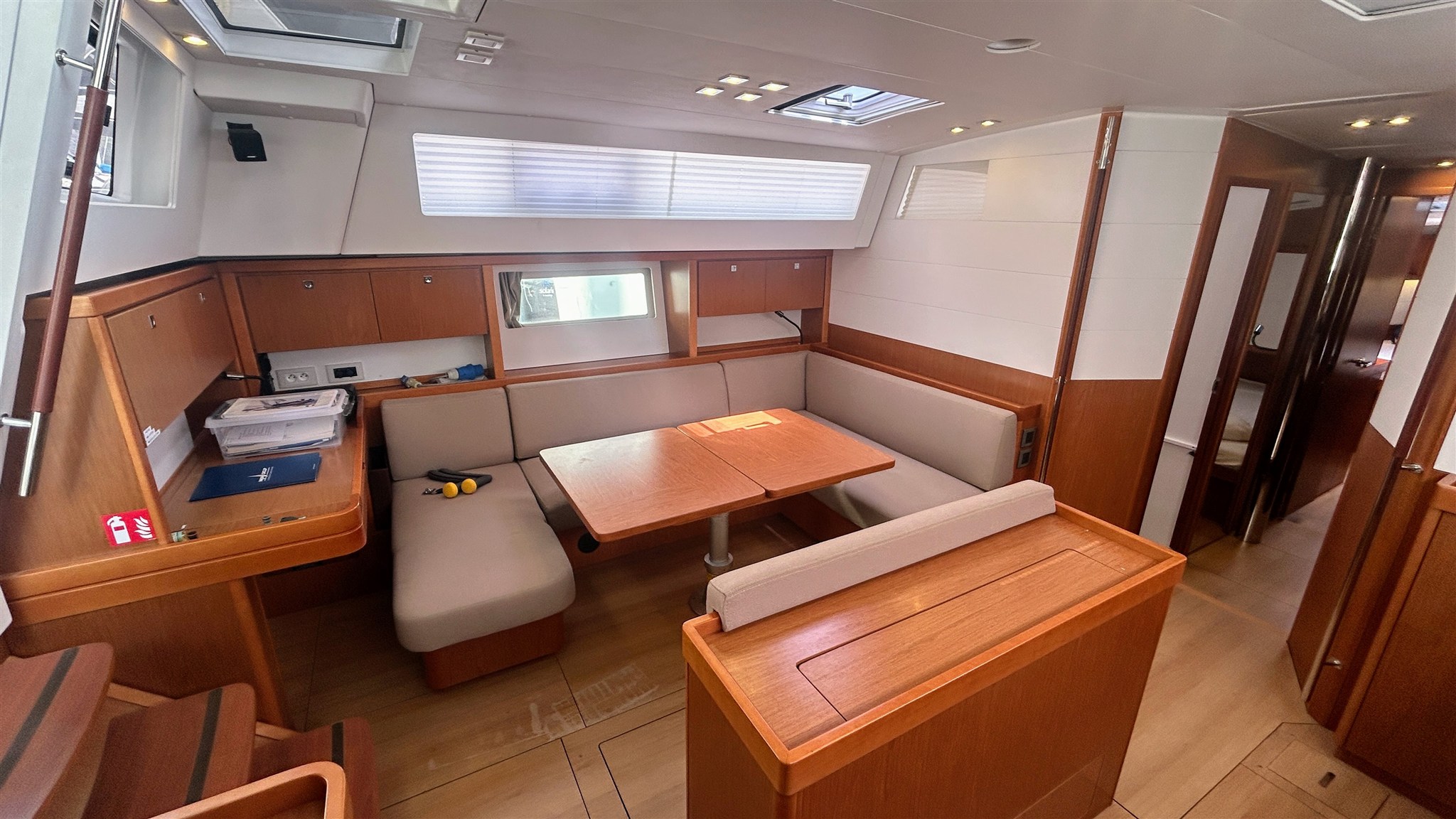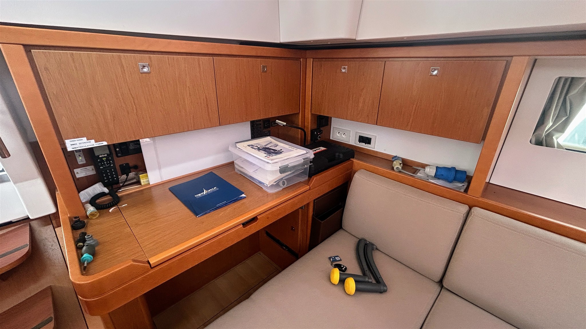 Alarme moteur, Ancre, Annexe (Highfield 2,40), 4 x Batteries (180 amp x 4), Chargeur de batterie, Cockpit en teck, Double barre à roue, Douche de cockpit, Eau sous pression, Echelle de bain, Éclairage de courtoisie, 2 x Filières avec sortie latèrale, Gréement monotoron, Guindeau électrique, Moteur d'annexe (5 cv SUZUKI), Passavant en teck, Plateforme arrière, Pompe de cale automatique, Pompe de cale électrique, Pompe de cale manuelle, Pont en teck, Prise de quai, Propulseur d'étrave (Quick), Rollbar, table de cockpit, Table pliante de salon (Hydraulique), 3 x Winch, Winch électrique.